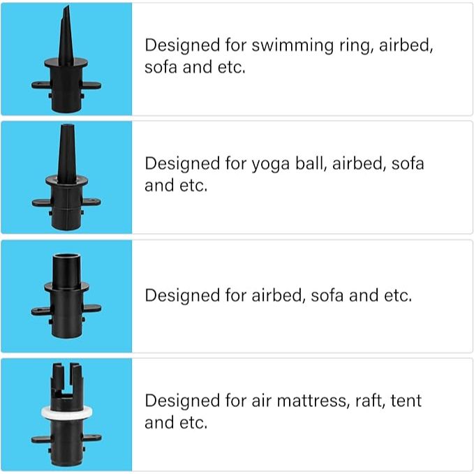 4 Removable Nozzles: The inflatable pump has 4 removable nozzles of different sizes, which can inflate or deflate different items on any occasion, making it easier for you to reach and use. Meet the needs of home and outdoor use without having to buy additional nozzles.