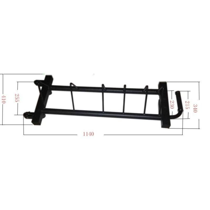 Storage slots for up to (4) 15-25KG plates, (4) 5-10KG plates, and (3) 5KG plates