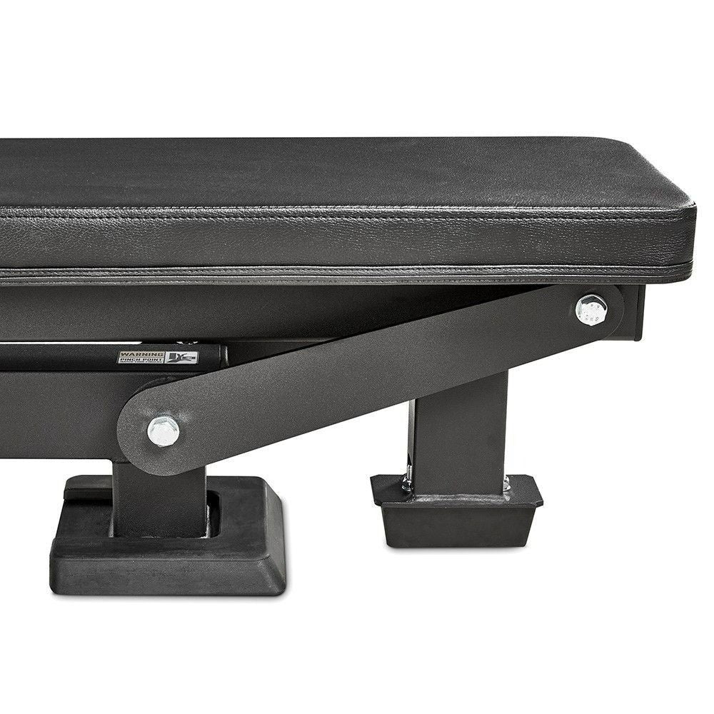 The adjustable leg/footrest offers 11 different support angles, enabling quick and easy positioning for various body sizes and exercise variations. The comfortable seat upholstery can be easily folded down into a long rowing bench with one hand, enhancing versatility and convenience during workouts.