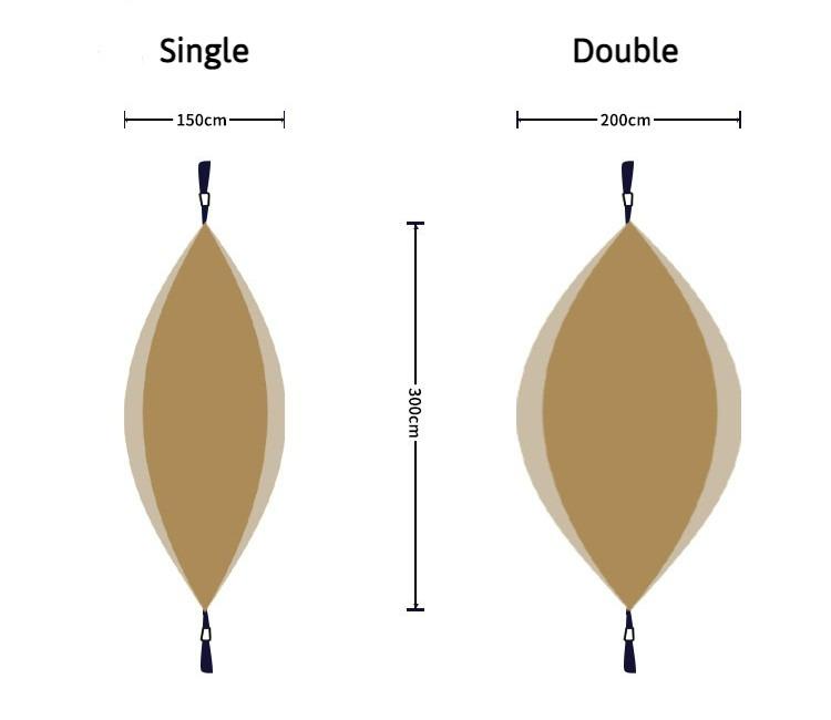 Compact: Lightweight and convenient, our travel hammock weighs only 680grams and folds to the size of an eggplant. Single Hammock measures at 300cm long by 150cm wide for one person, and the Double Hammock measures 300cm long by 200cm wide for either two people or anyone who wants some extra space. Throw it in your backpack and go!
