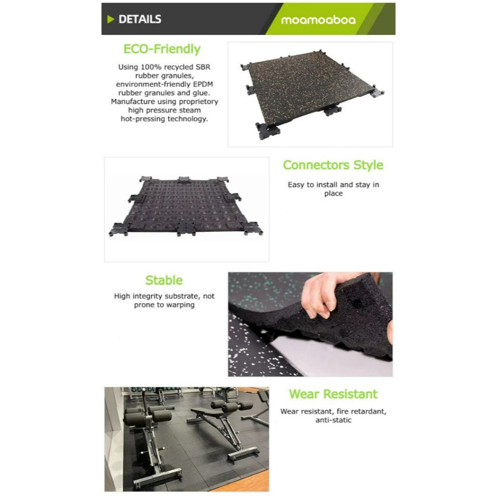 3. Convenient Connector System: Each 1m by 1m (39.4 inches by 39.4 inches) mat comes with a built-in connector system. These connectors allow the mats to easily connect with each other, creating a secure and seamless flooring surface. The connector system ensures stability and prevents the mats from shifting during workouts.