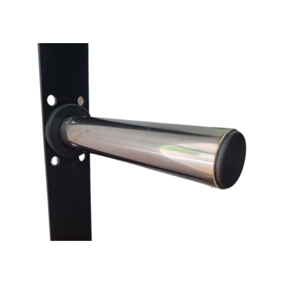 3 PEG PLATE HOLDER- Plate rack features 3 stainless steel-plated, solid steel weight storage pegs for Olympic bumper plates. Each plate storage peg has a loadable sleeve length of 40cm and can hold up to 100kg (300kg total max weight load).