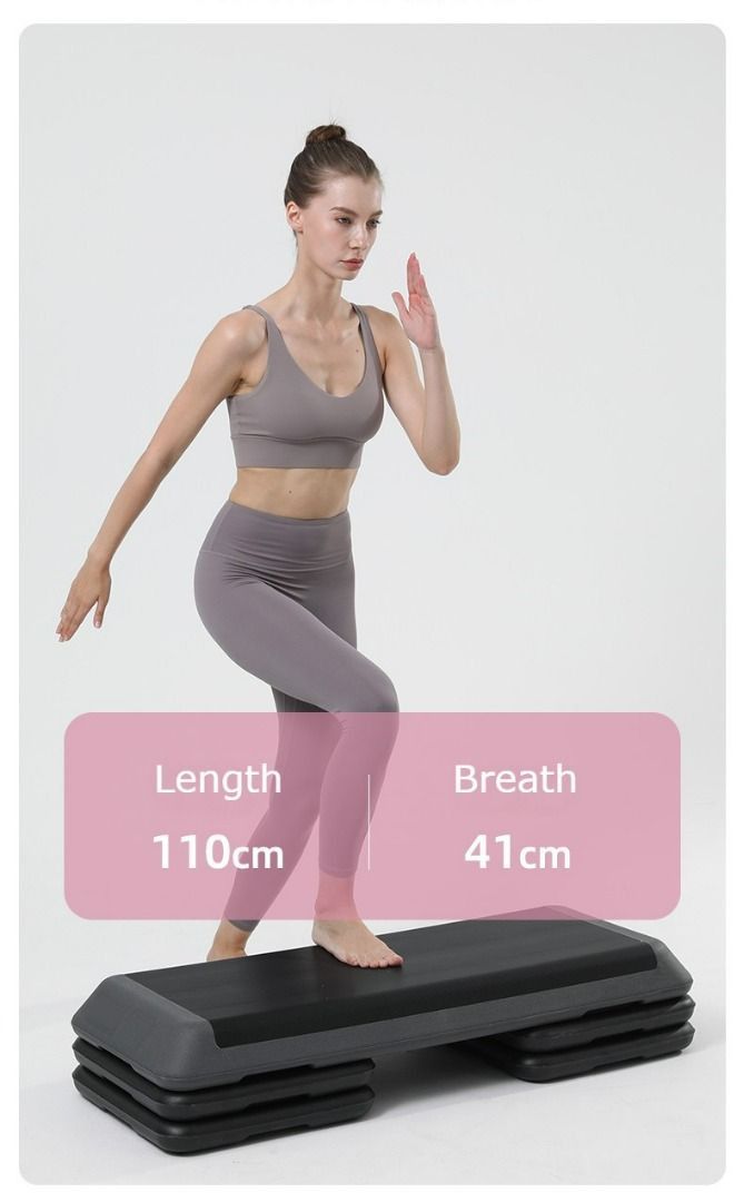 110cm LENGTH X 41cm WIDTH ANTI-SLIP STEP SURFACE: Slip-resistant, shock-absorbing aerobic step platform with additional removable 41cm x 41cm x 5cm risers provide a steady, safe, space-efficient and comfortable step workout experience